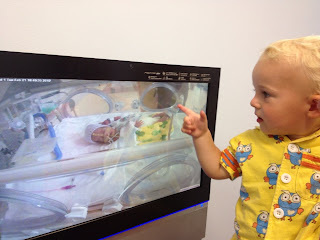 Oscar, Robs and I have all been a bit under the weather of late, the three of us experiencing your garden variety cold. Unfortunately this means we can't get into the NICU to see Lucy. However, technology can be a wonderful thing! Using a webcam and a viewing room, we were able to go in and see Lucy from afar, which was especially cool as it was the closest Oscar's been to his little sister. (Remember - only Robs, myself and our respective parents can enter the unit.) Fingers crossed we'll be a bit better tomorrow so normal visits can resume.