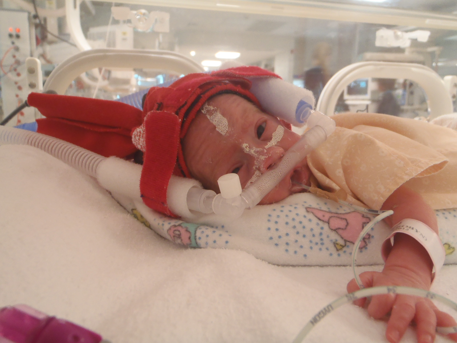 Lucy was deemed not quite strong enough to try Long Prong CPAP on Thursday, so Robs and I were a bit flat for the rest of the day thinking it'd be another week before they'd try again. However, on Friday they team were keen to give it a go, and Lucy surprised us all by lasting for the whole afternoon! Although buoyed by this news, we still weren't celebrating at that stage as we were convinced that on Saturday she'd tire and be back on the ventilator, but to our amazement - Saturday (and then even Sunday) remained ventilator-less! Then come this morning, the doctors decided to give her a crack at 'proper' CPAP, and as of 8pm she's still going strong with good sats and gases. It won't be totally unexpected if she doesn't last, but having had 4 days without a machine doing all her breathing will be strengthening her lungs significantly and we're daring to dream! We're also happy that Lucy's resident doc was just as stoked as us with her sudden improvement!