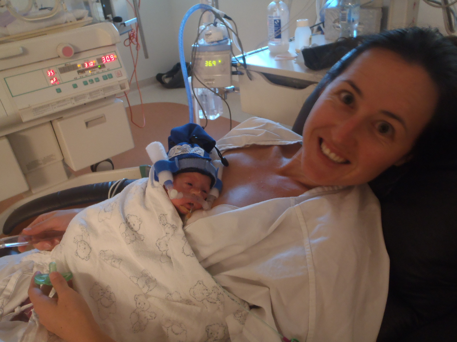 Lucy's been killing it again. I told you in my last post that there was a chance she would be tried off CPAP to see how she went. Well, she got down to the required PEEP of 5 cm H2O and maintained good sats during the week, so they gave her a go on Easter Saturday - and she lasted the whole hour! Now, just two days later, they've got her on a cycle involving 6 hours of CPAP followed by 3 hours of breathing with just an extra dash of oxygen. So the top picture is what she wears during the CPAP hours, and the bottom one is her with just the nasal prongs: