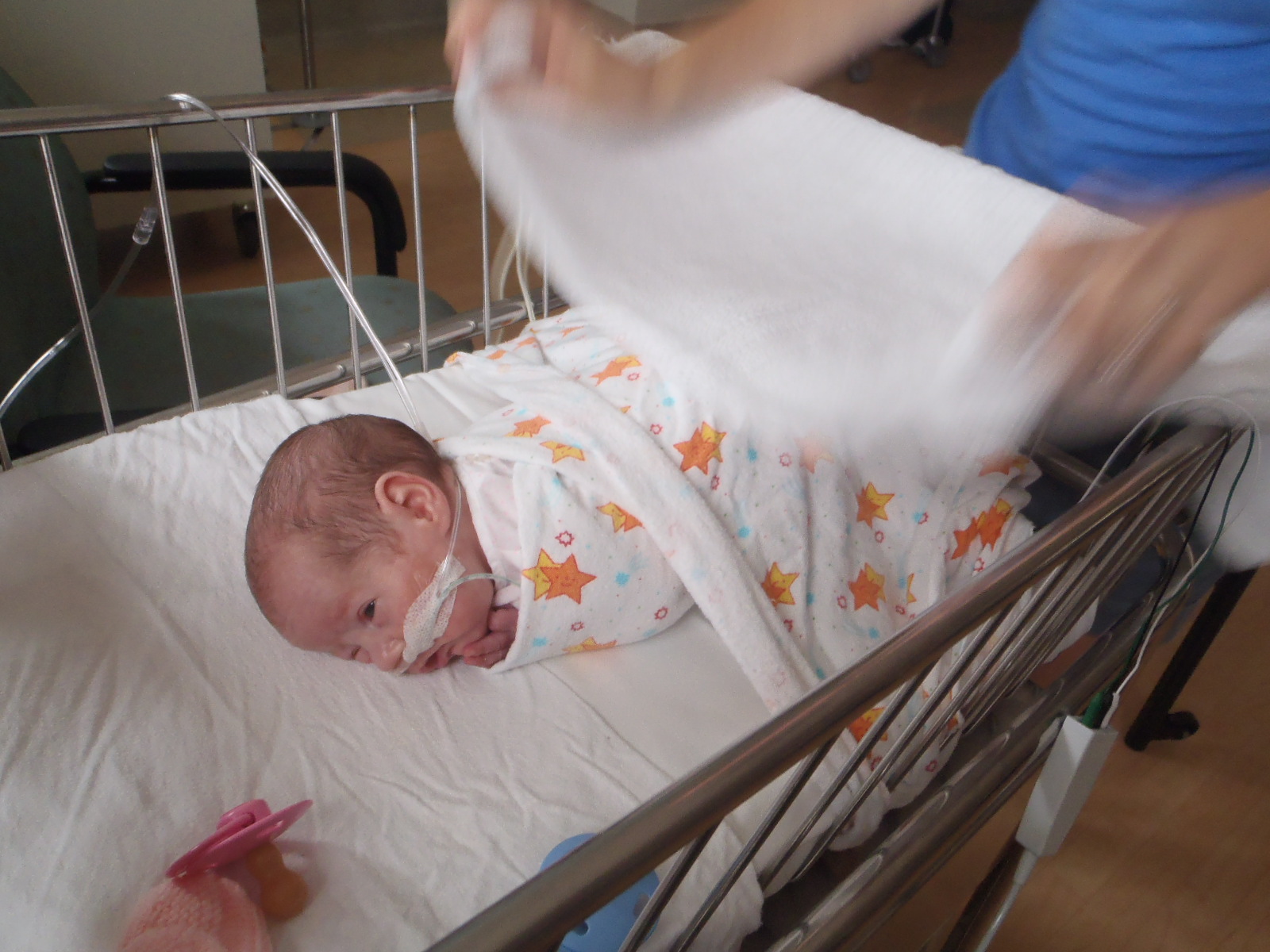 Progression towards discharge seems to be continuing smoothly. The oxygen being delivered through the nasal prongs is being weened at an appropriate rate, and she's up to about one 'sucky' feed for every one tube feed. Once she's strong enough to allow abolition of the tube feeds, she'll be ready to come home and meet everybody.